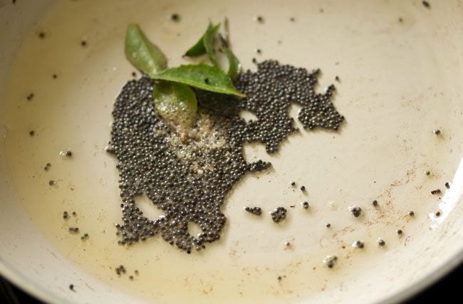 - Heat in the same pan or a tadka pan. Keep the heat to a low. Add mustard seeds and let them crackle.