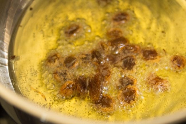 10. Next, add 1 tablespoon raisins. When the raisins puff up, remove and keep aside.