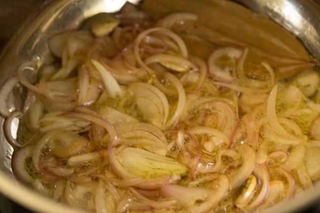 - Next add ½ cup of thinly sliced onions and sauté till they turn translucent.